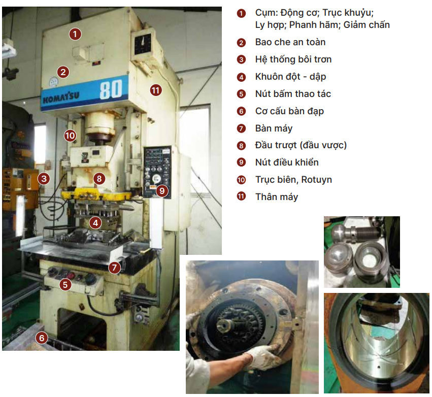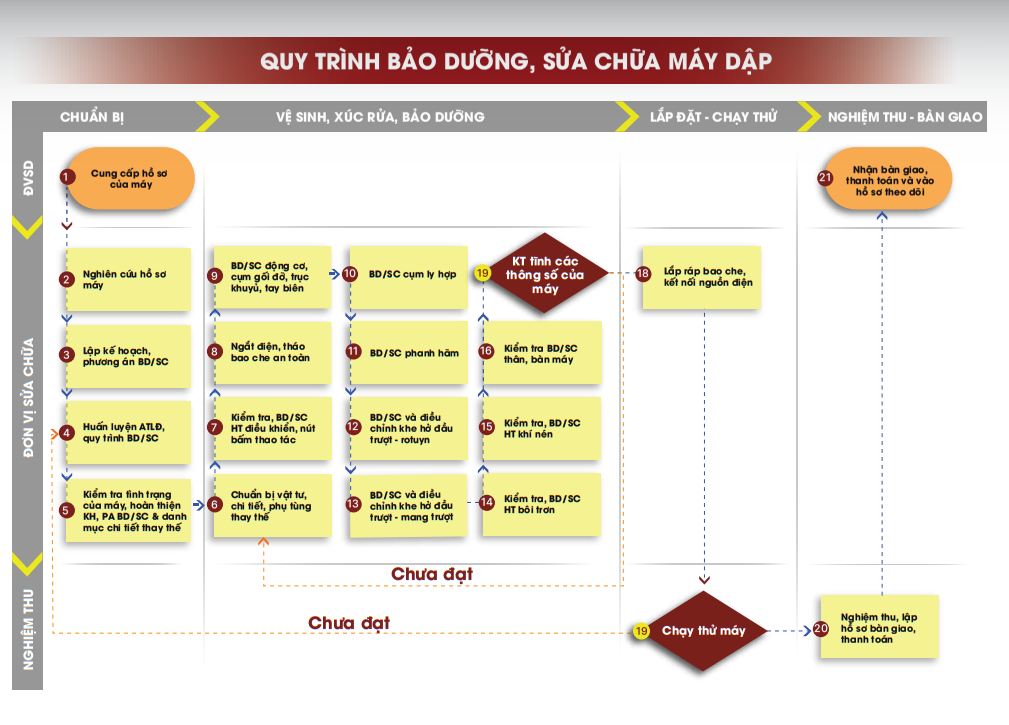 Vệ sinh, thông tắc đường dầu/ mỡ bôi trơn; cân bằng, căn chỉnh các bộ phận, cụm, cơ cấu; Thay thế/ SC phục hồi các chi tiết bị mòn hỏng: Vòng bi, bạc biên, gối đỡ, mang trượt, cối an toàn… nhằm duy trì sự hoạt động bình thường của máy.